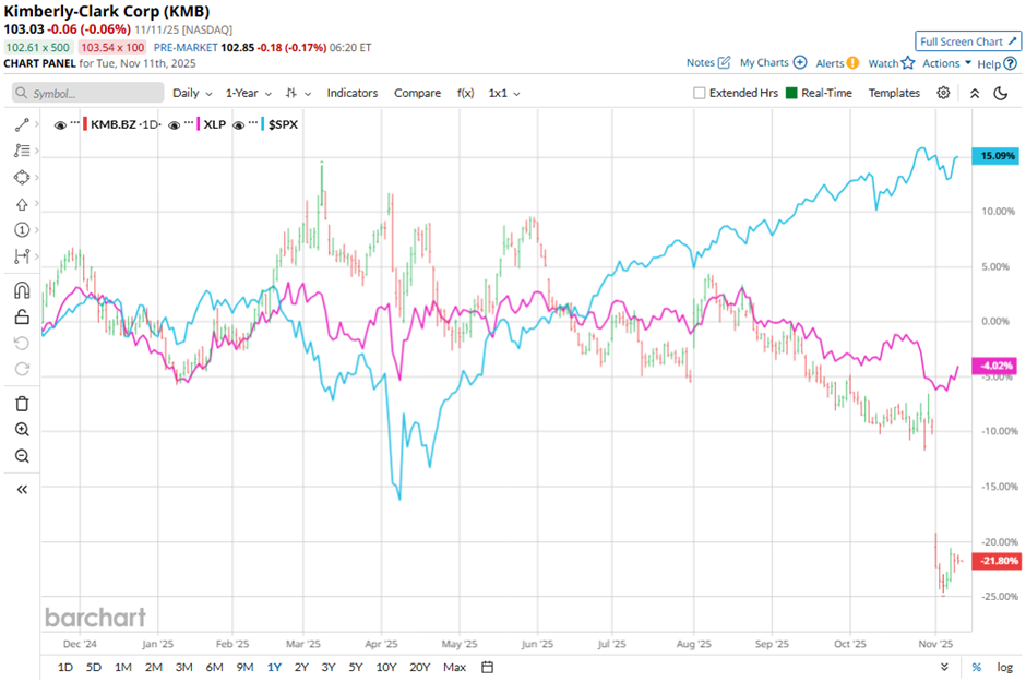 Shares of the Dallas, Texas-based company have underperformed the broader market over the past 52 weeks. KMB stock has decreased 22.7% over this time frame, while the broader S&P 500 Index ($SPX) has gained 14.1%. Moreover, shares of the company are down 21.4% on a YTD basis, compared to SPX’s 16.4% rise.