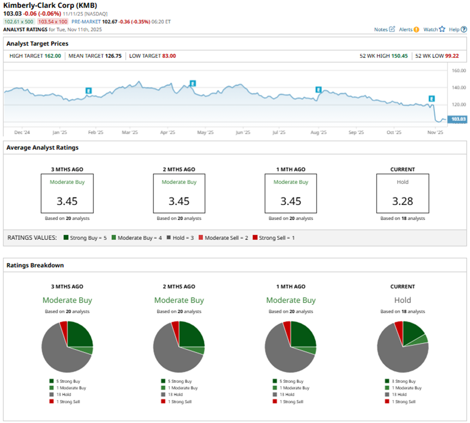 On Nov. 4, Morgan Stanley cut its price target on Kimberly-Clark to $125, maintaining an “Equal Weight” rating.