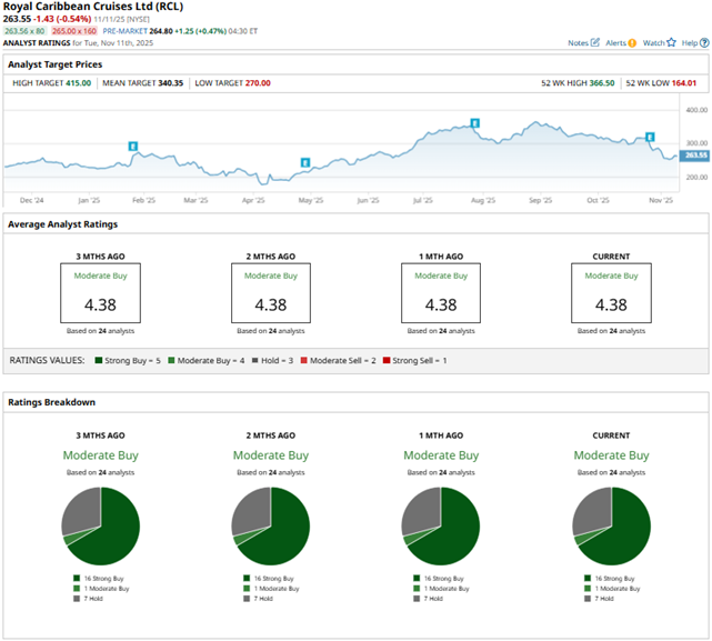 Among the 24 Wall Street analysts covering Royal Caribbean’s stock, the consensus is a “Moderate Buy.” That’s based on 16 “Strong Buy” ratings, one “Moderate Buy,” and seven “Holds.” The ratings configuration has remained the same over the past three months.