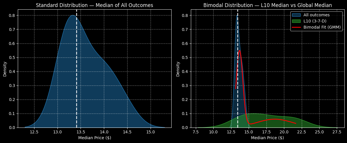 However, under 3-7-D conditions, the principles of heteroskedasticity reveal that the distributional outcomes expand quite dramatically, between $7.50 and $27.50. Yes, there’s a lot of risk involved but the reward potential is exponentially more robust. Further, price clustering occurs on average around $16. What’s interesting, though, is that there’s not much density difference at $16 versus $17.50.