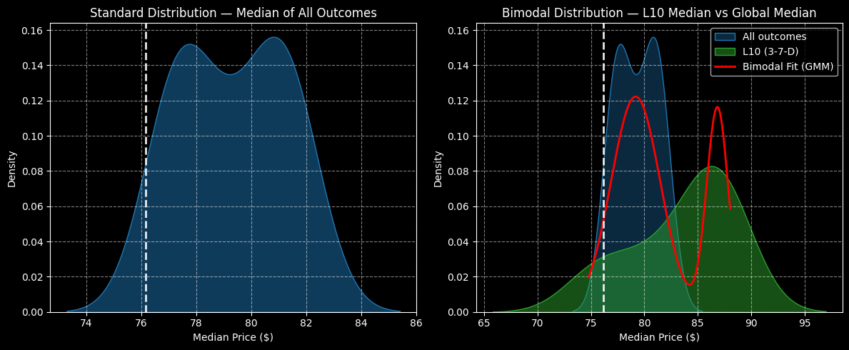 But the arbitrage opportunity that we’re seeking is the expected outcome under 3-7-D conditions, not just in the aggregate. When running 3-7-D iterations, prices tend to cluster at $86.50 over the next 10 weeks. So, with that being the case, I’m really loving the 80/85 bull call spread expiring Jan. 16, 2026.