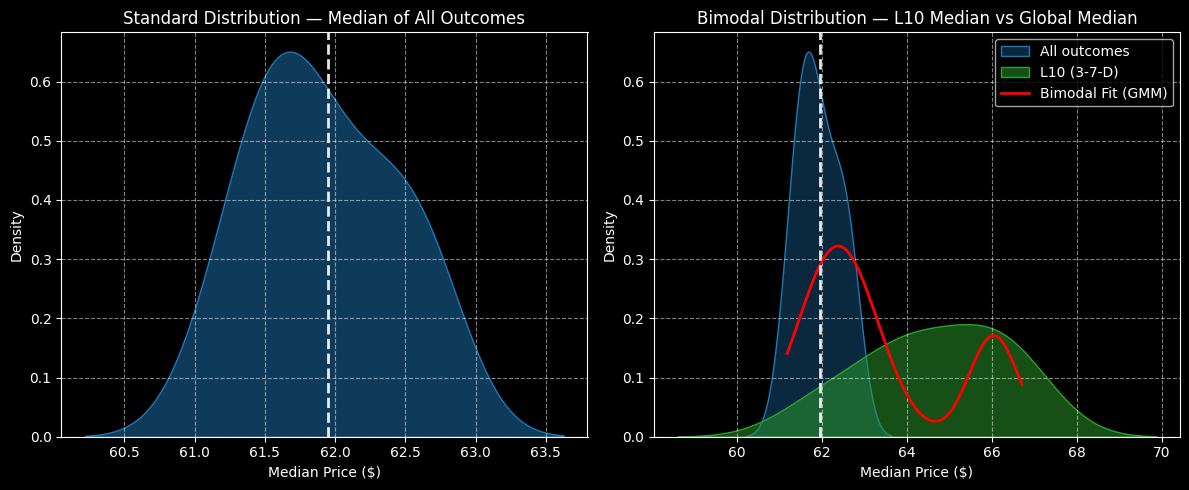 However, under the quantitative approach (KM-KDE), the statistical response to the 3-7-D is different from other sequences (like 7-3-U for instance). One of the biggest differences comes in probability density. Using a reified, iterated logic, price clustering under aggregate (baseline) conditions would likely occur at around $61.70 over the next 10 weeks.