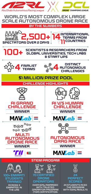 The Abu Dhabi Autonomous Racing League (A2RL), part of the Advanced Technology Research Council (ATRC), in collaboration with the Drone Champions League (DCL), concluded the inaugural A2RL x DCL Autonomous Drone Championship in the Middle East, at ADNEC Marina Hall, Abu Dhabi, UAE. In a major breakthrough for autonomous flight and aerial robotics, Team MavLab’s AI drone outpaced a world-leading human pilot to win the AI vs Human Challenge. The head-to-head duel was the most complex ever staged, featuring finalists from the DCL Falcon Cup—some of the top drone pilots in the world.
